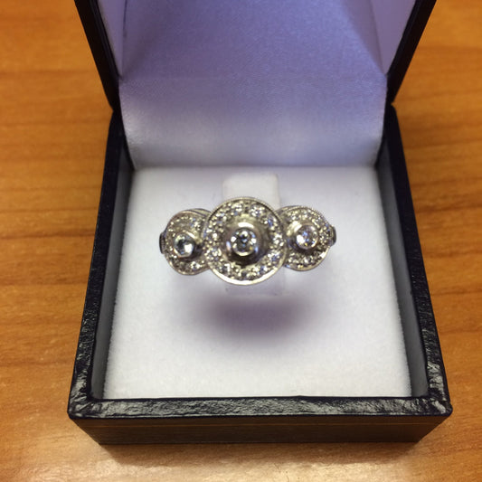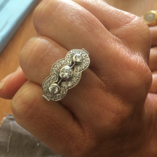 ZAJ10 Anillo Tricillo Vintage Asimetrico 3 Diamante Central Mayor en Cabezal Puente Calado y Ruleteado Oro Blanco