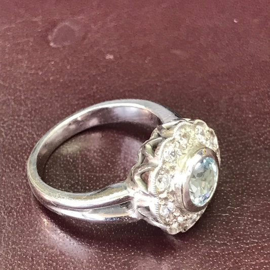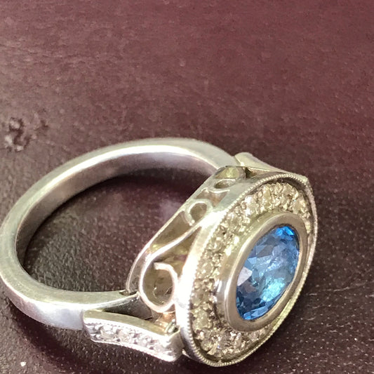 ZAJ13 Anillo Topacio Azul Facetado Cabezal Calado Circones Suizos En Laterales Plata