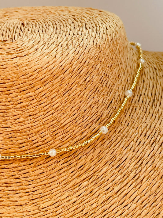 ZO4065 Collar Perlas 3 mm y Mini Mostacillas 1.2 mm Largo 40 cm y extensor de 5 cm Collar Baño Oro