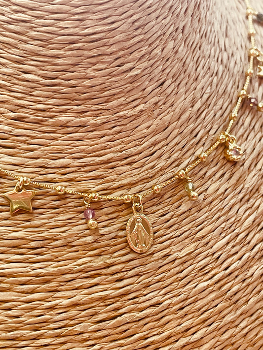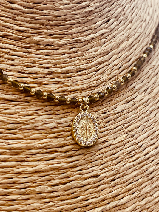 ZO4006 Collar Mostacillas Bolitas Espinela Virgen de los rayos Baño Oro