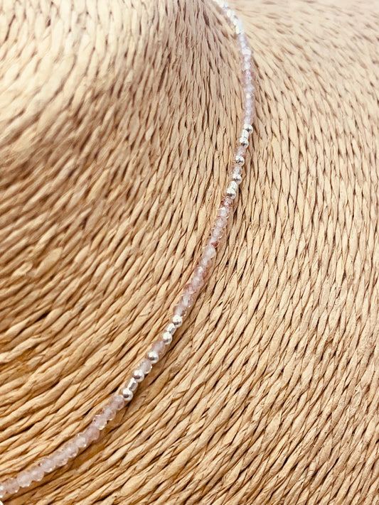 ZP4037 Collar Bolitas Mostacillas Cuarzo Rosa Virgen de Los Rayos Baño Plata
