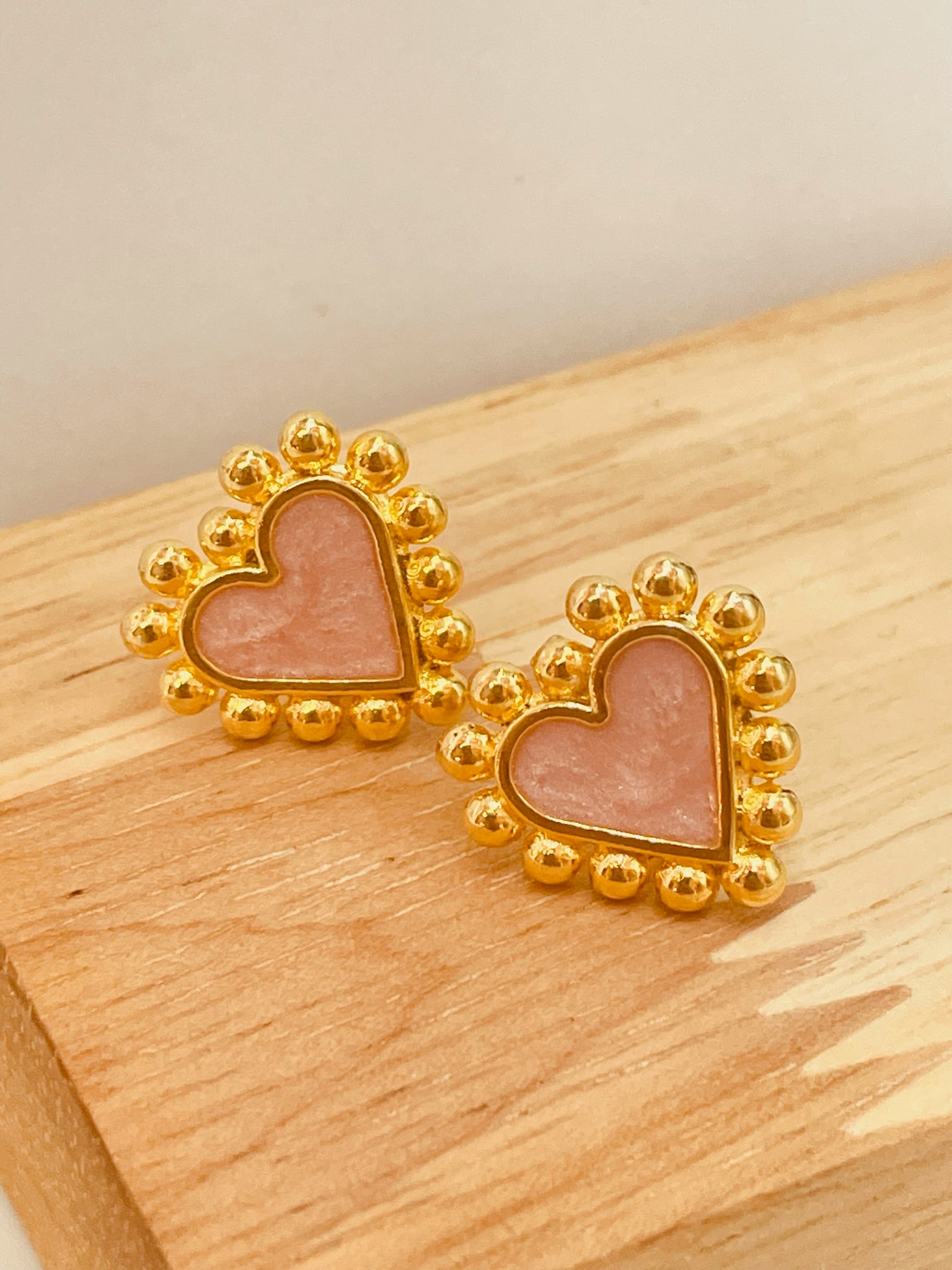 ZO2507 Aro Corazon Bolitas con Resina Rosada Baño Oro
