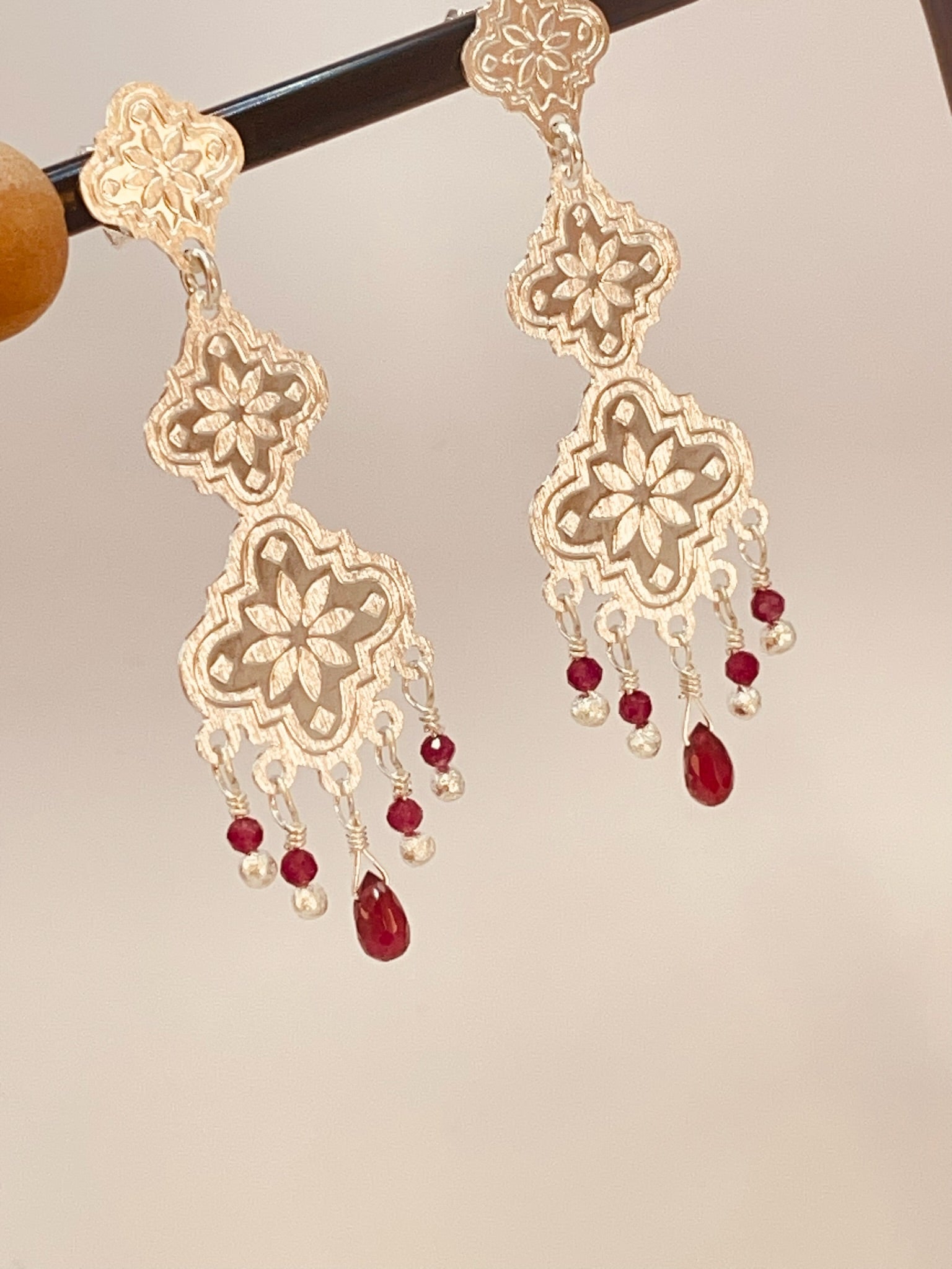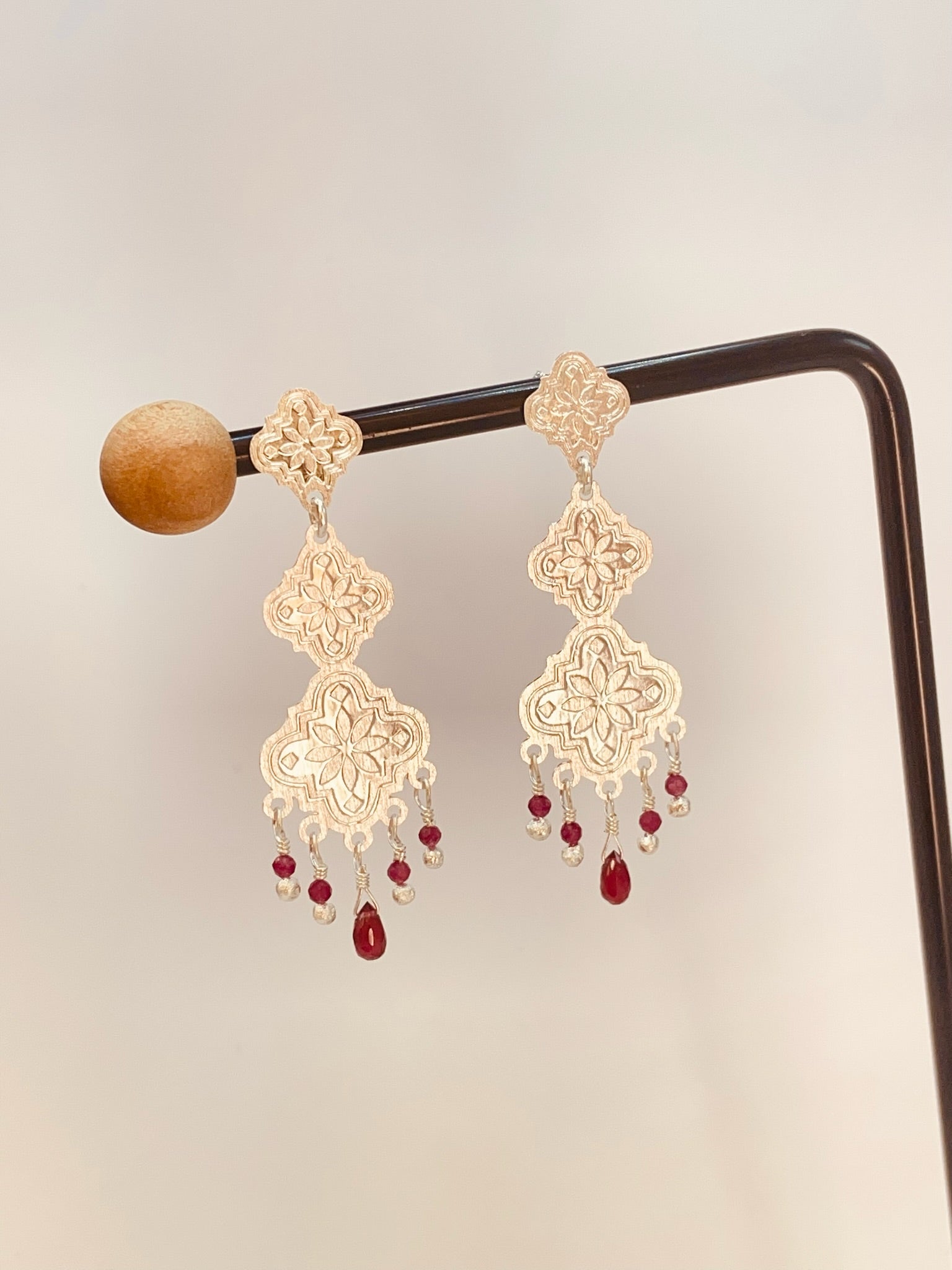 ZP2527 Aro Triple Mándala Rubí Rondeles y Gota Baño Plata