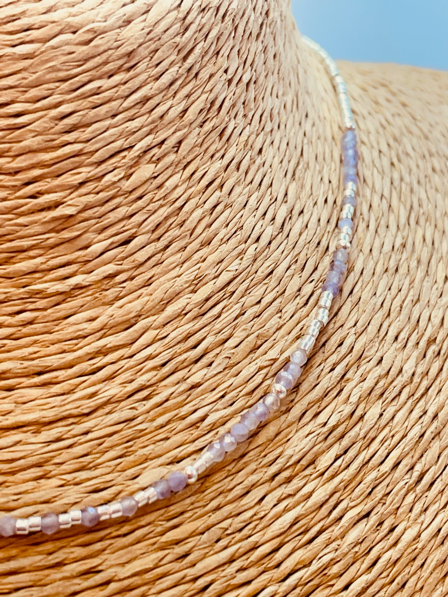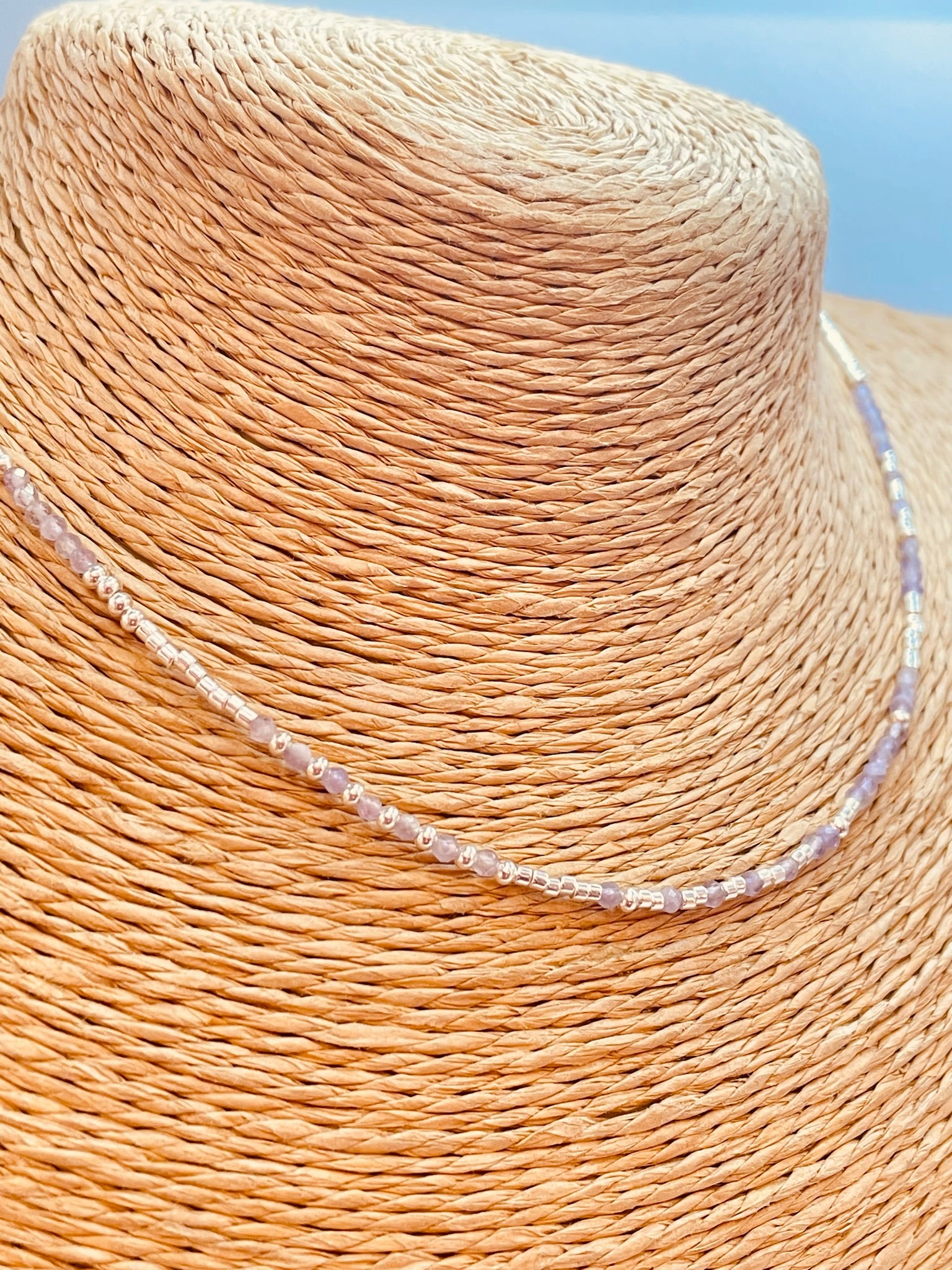 ZP4033 Collar Mostacillas Bolitas Amatista Baño Plata