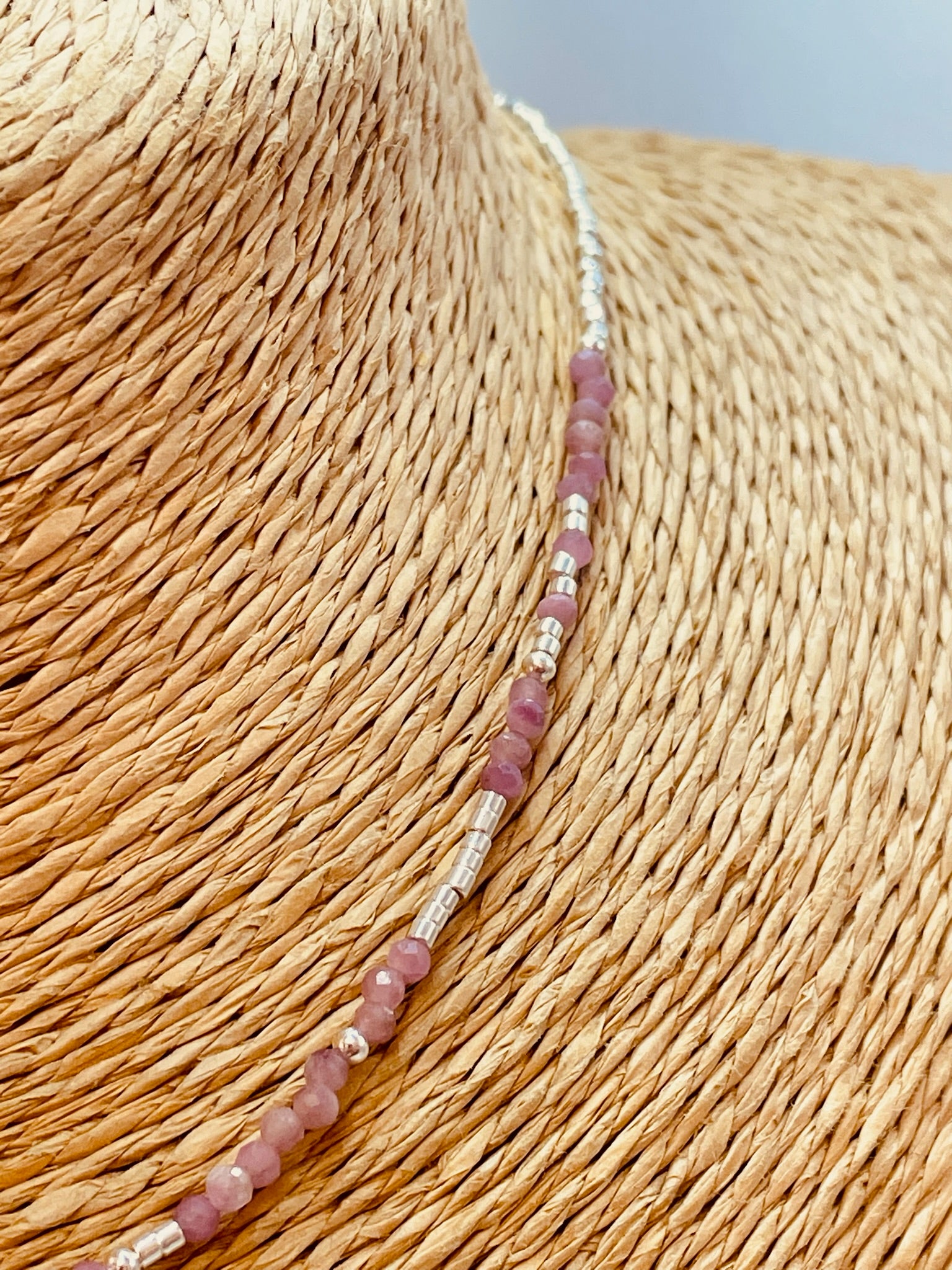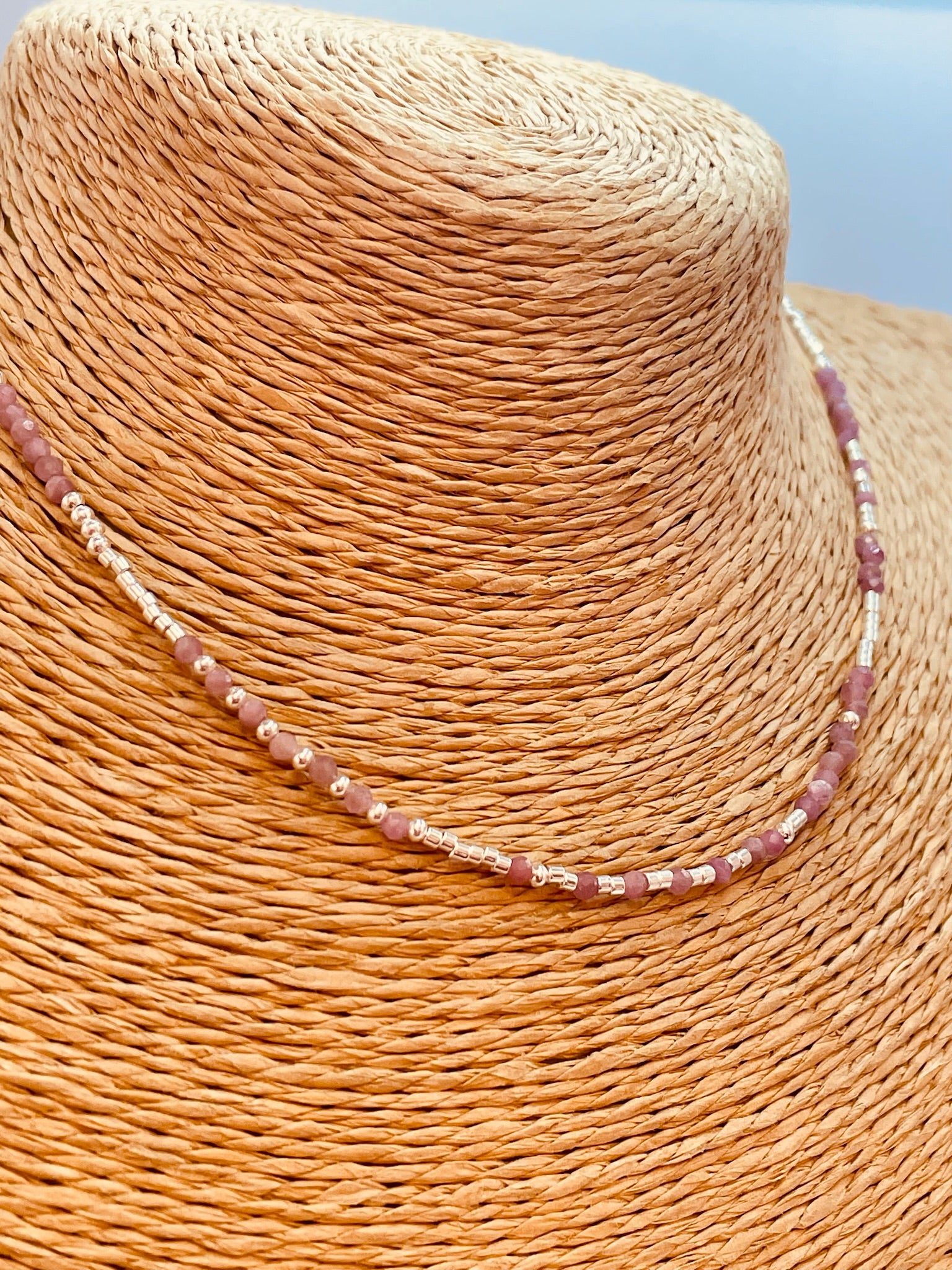 ZP4028 Collar Bolitas y Mostacillas Turmalina Rosa Baño Plata