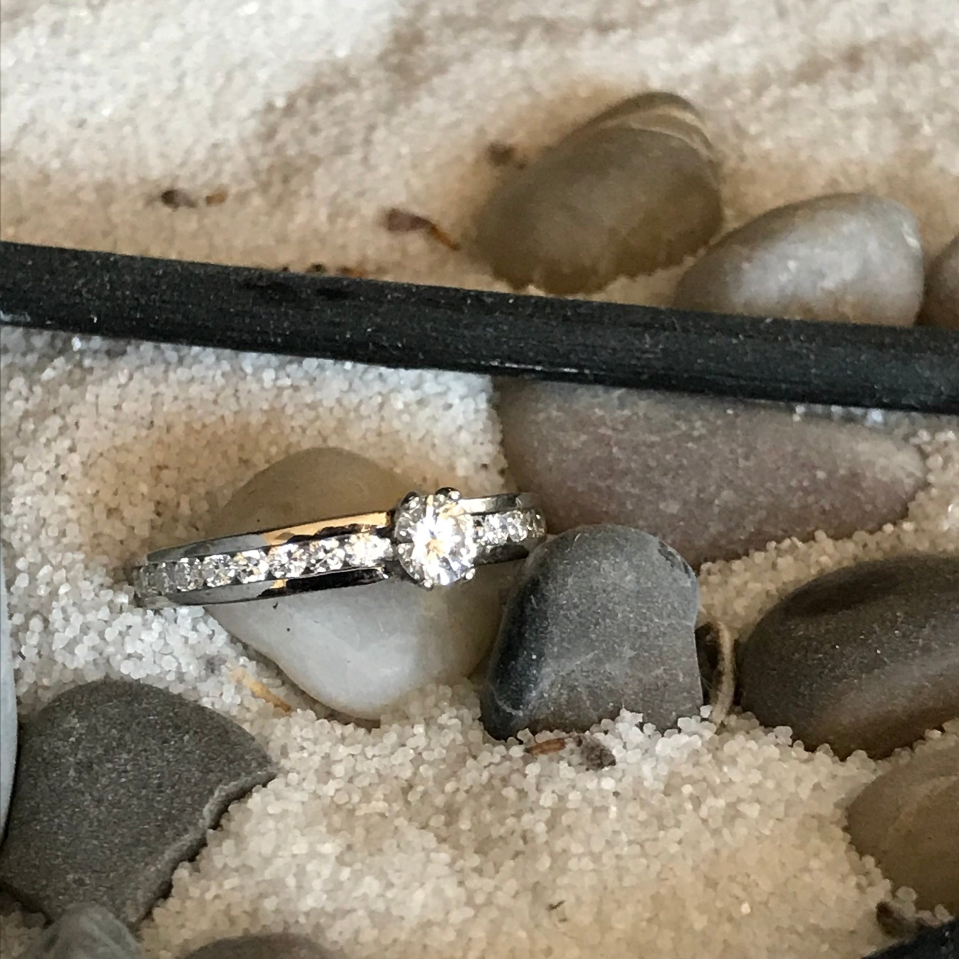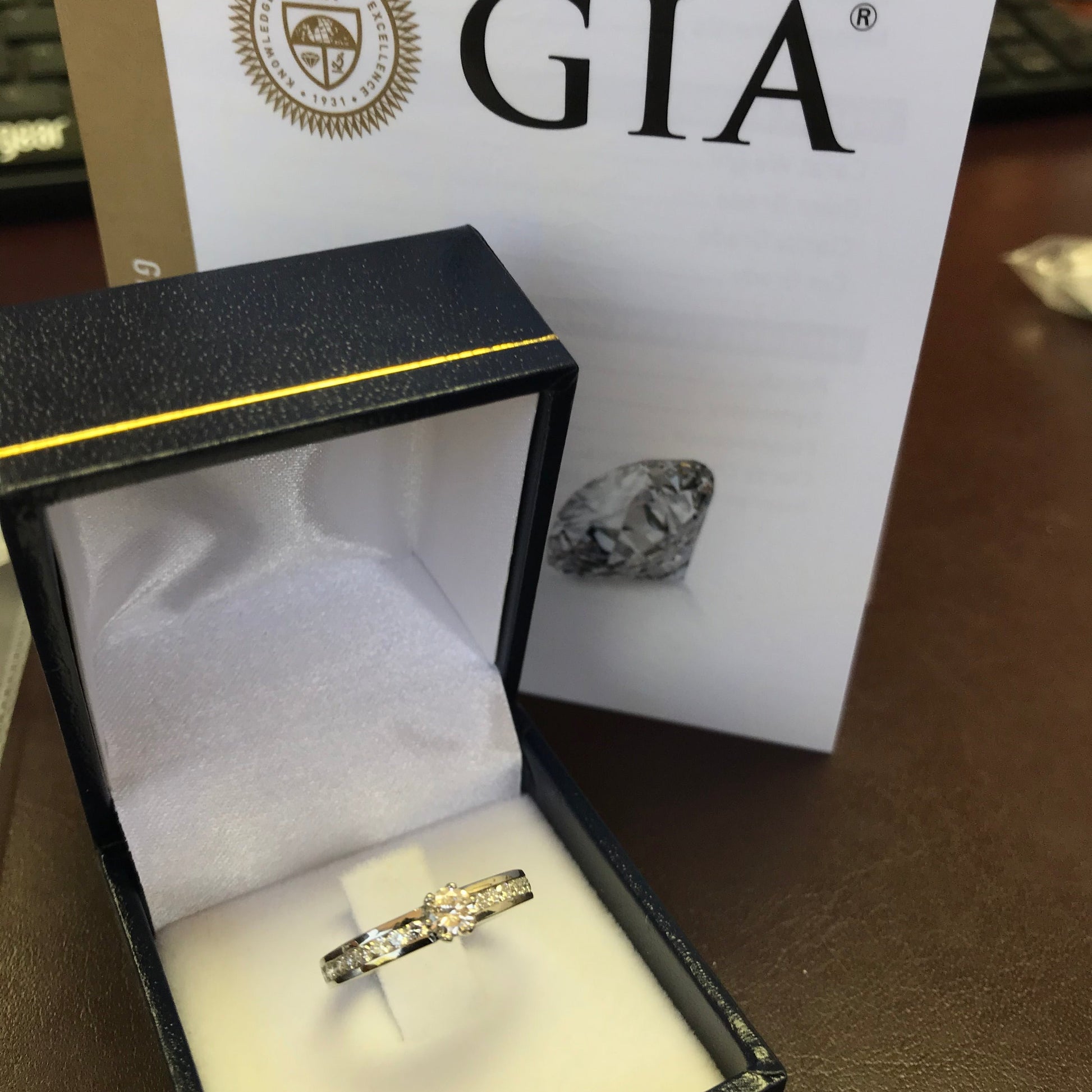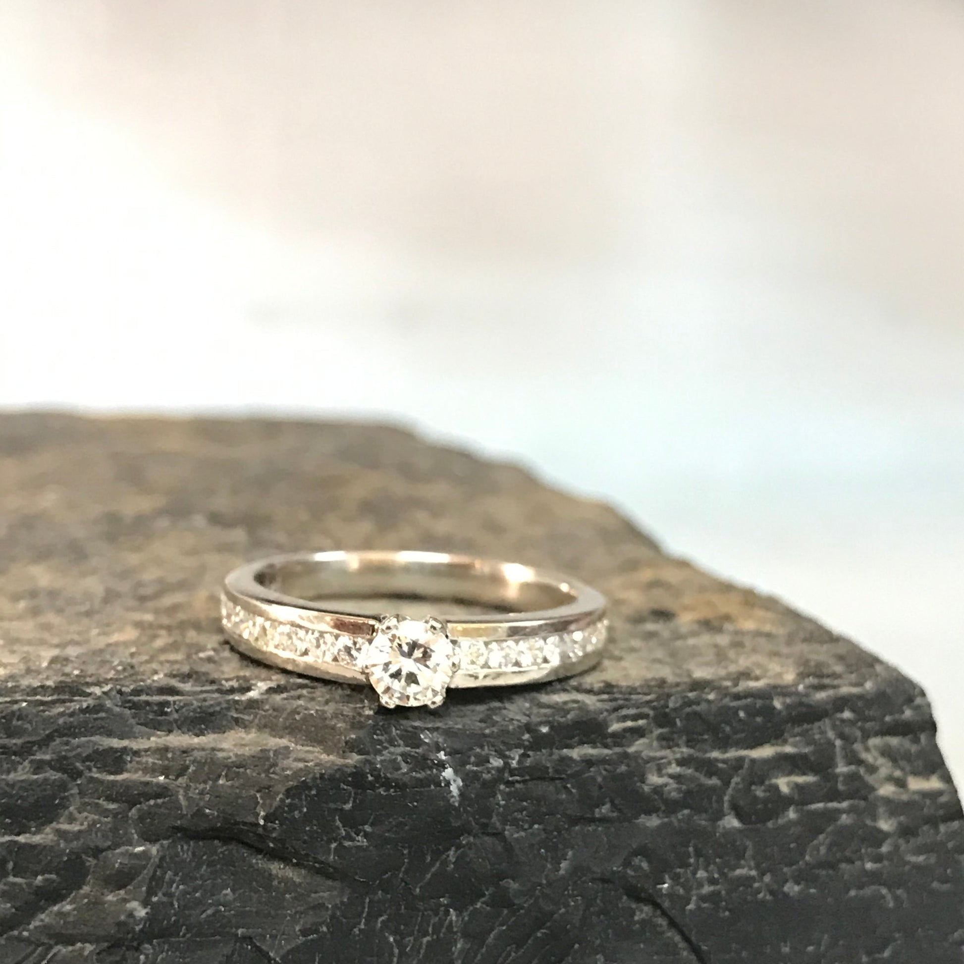 ZAJ18 Anillo Solitario Clásico Diamante Central Engastado en Grifas Y Diamantes Laterales Engastados en Riel Platino
