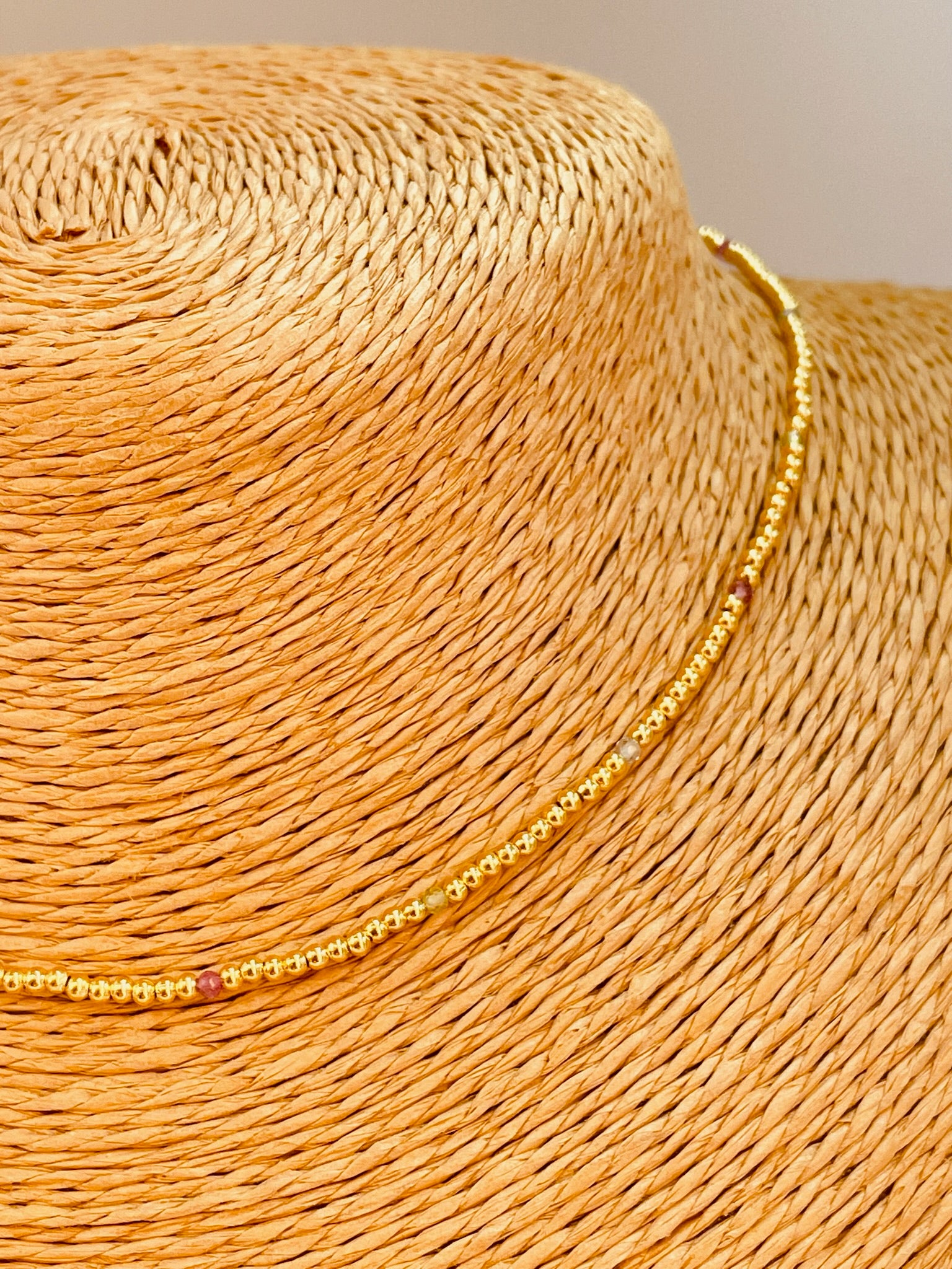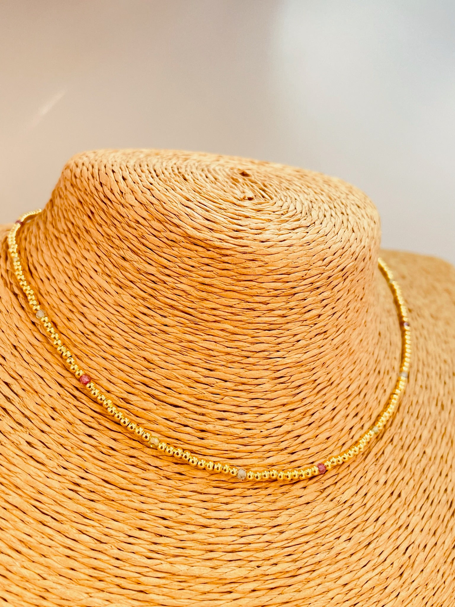 ZO4054 Collar Mini Bolitas 2 mm y Agua Marina y Cuarzo Rosa 2 mm Largo 40 cm y extensor 5 cm Collar Baño Oro