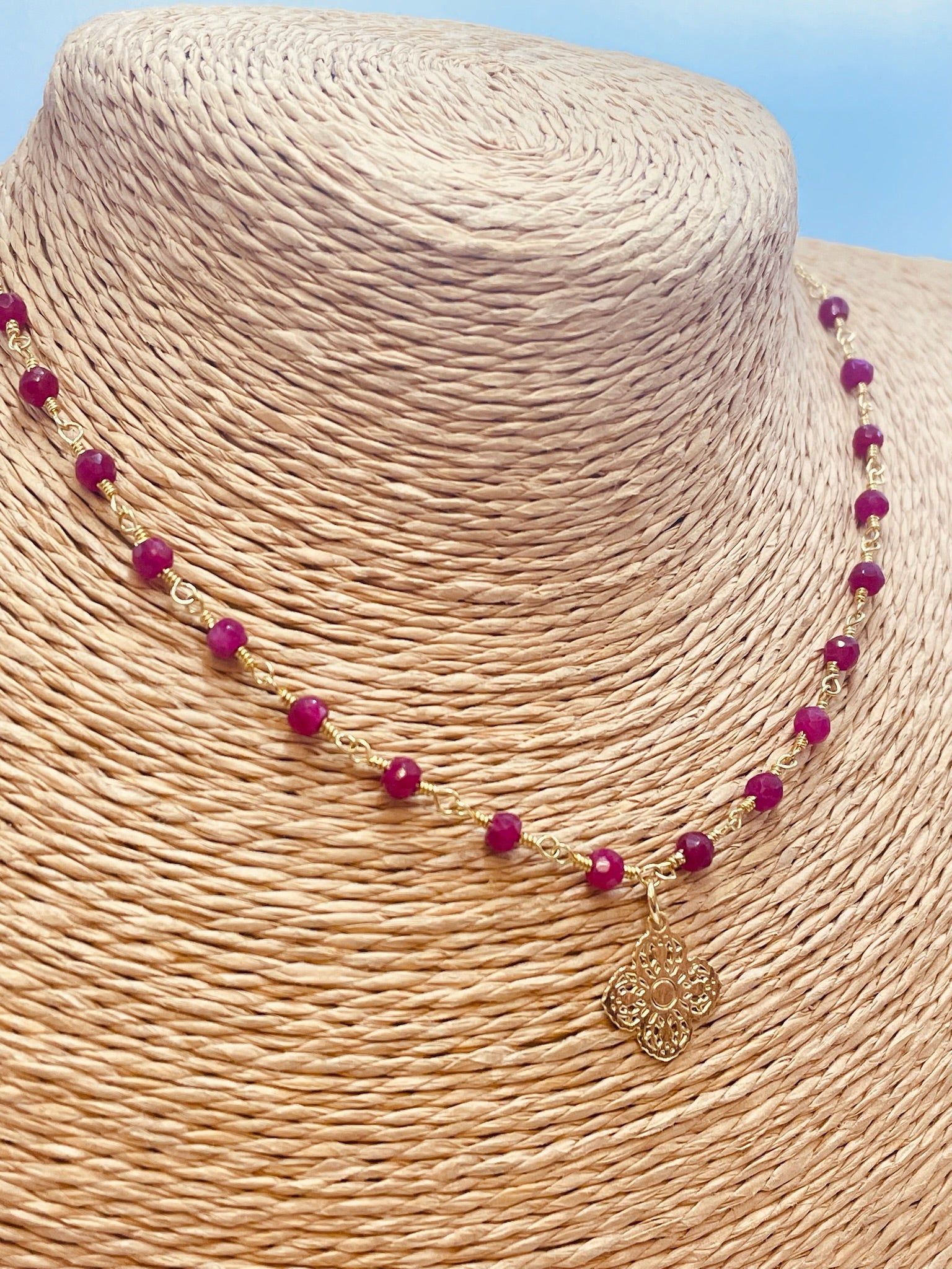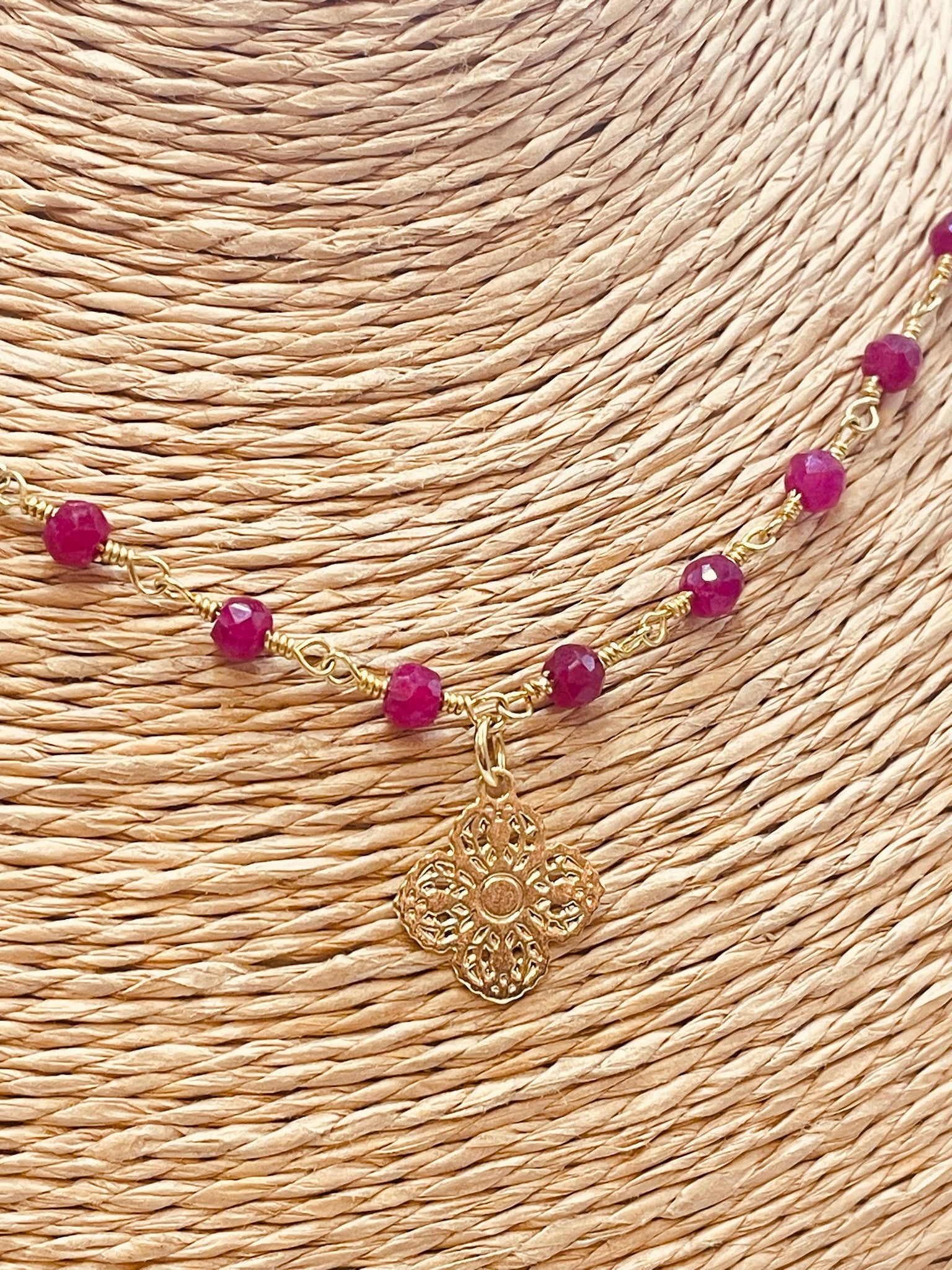 ZO4038 Collar Entorchado Raíz de Rubí 40 cm mas extensor 5 cm Mándala Baño Oro